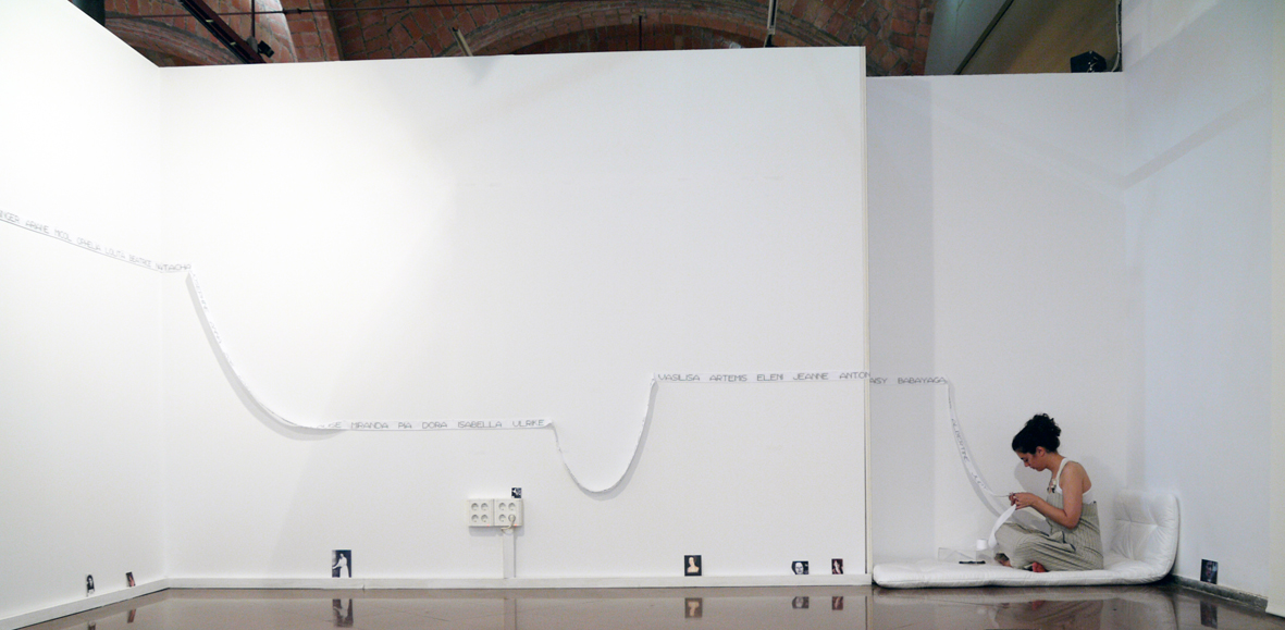 The project starts with a private action becoming a public performance to emphasize the visibility of the production of the exhibited piece. The artist is exhibited as well, as an element of the piece and in dialogue with it, to foster a rethinking of the limits of art as an activity in which a final result, basically tangible and closed, is sought.